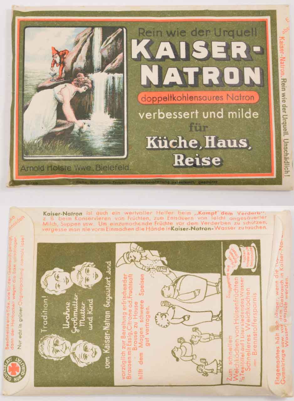 PHYSICAL DESCRIPTION: An unopened package of sodium bi-carbonate (baking soda). The package measures approximately 11.5cm x 7.5cm. Makers marked, "Kaiser-Natron".