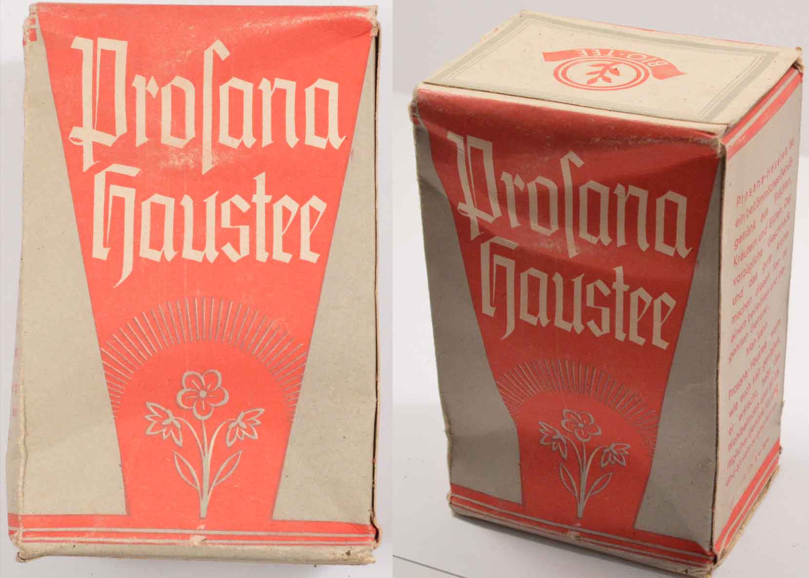 PHYSICAL DESCRIPTION: An approximately 12.5cm x 8.5cm x 6.5cm, unopened package of tea. The package is labeled, "Profana Haustee" and makers marked, "M.J. Oestreicher, München 38."
