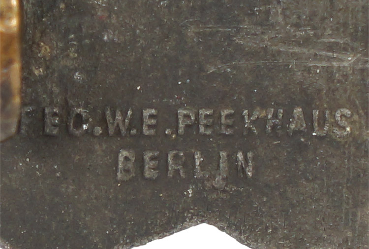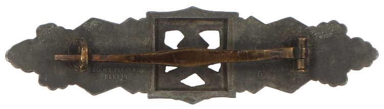 PHYSICAL DESCRIPTION: Nicely detailed, die struck zink construction clasp. The clasp features a central square panel with a recessed background field with an embossed national eagle with out-stretched wings, positioned above a crossed bayonet and grenade, flanked by four oak-leaves and dual acorns superimpose on a ribbed, horizontal outward, pointing base. The recessed central square is missing its backing plate. The reverse has a solid, soldered, hinge inset into a rectangular recess with raised outer edges, a broad, tapering, horizontal pin and catch inset into an oval recess with raised outer edges all intact. The reverse is well marked with the faint, embossed designers name and location, "Fec. W. E. Peekhaus Berlin", and the manufacturers initials, "FLL.", with each initial encompassed by a circular border indicating manufacture by Friedrich Linden of Lüdenscheid.