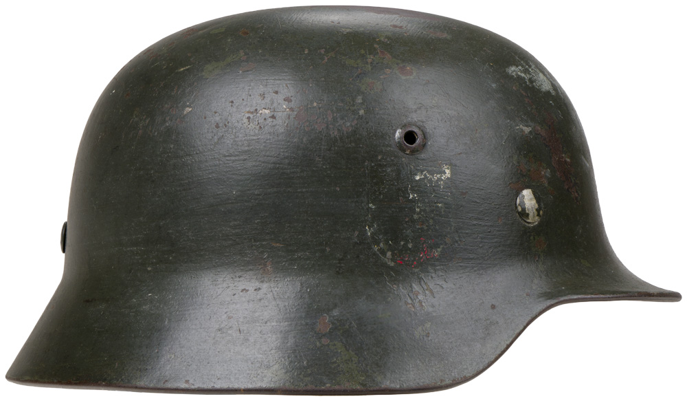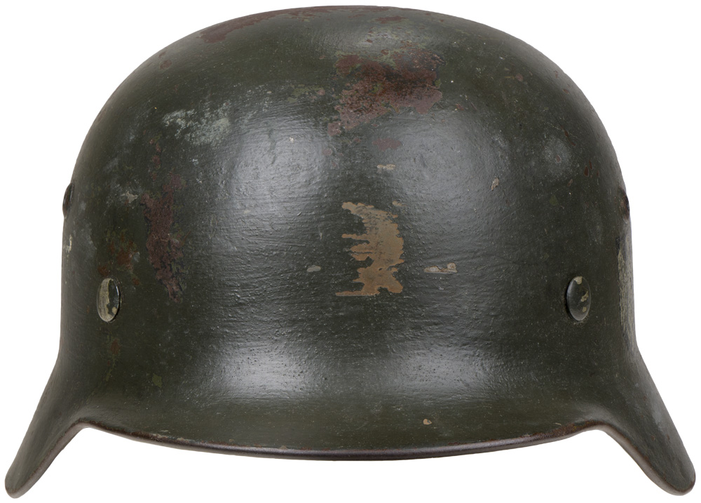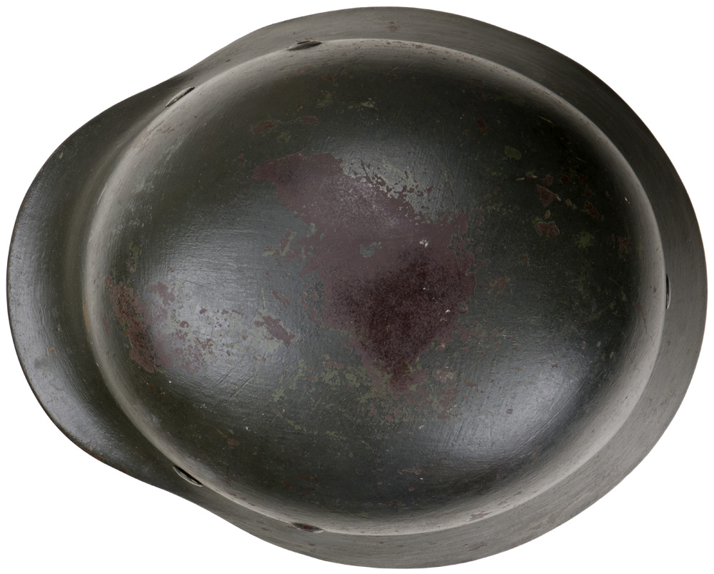 PHYSICAL DESCRIPTION: The stamped, sheet steel construction helmet most of its original feldgrau overpaint.