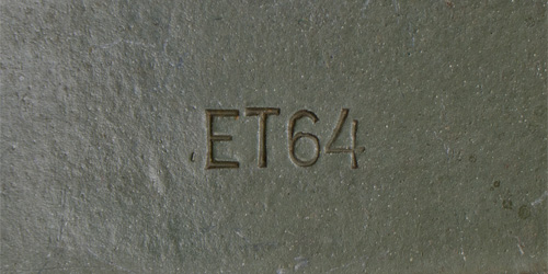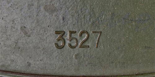 The left side of the helmet has a Wehrmacht eagle shield decal which is retained 85% (painted around). The right side of the helmet has a national tri-color shield decal which has been over painted in accordance to regulations. All three liner retaining rivets and both inserted ventilation bushings are all intact. The interior of the helmet has a light tan, M31 leather liner with all eight fingers and the original tie string intact. The liner is well marked with a black size inkstamp, "56". The interior reverse neck guard apron is serial/lot number stamped, "3527", and the interior left side apron is stamped with the manufacturers code and size, "ET64", indicating manufacture by Eisen-und Hüttenwerke, AG Thale/Harz, size 64. Original chinstrap. Very nice UNTOUCHED helmet.