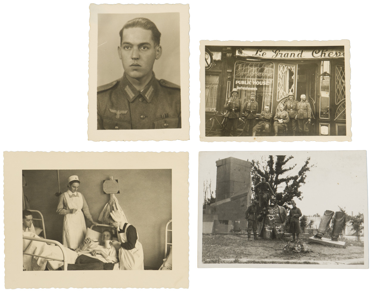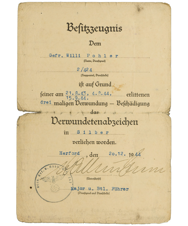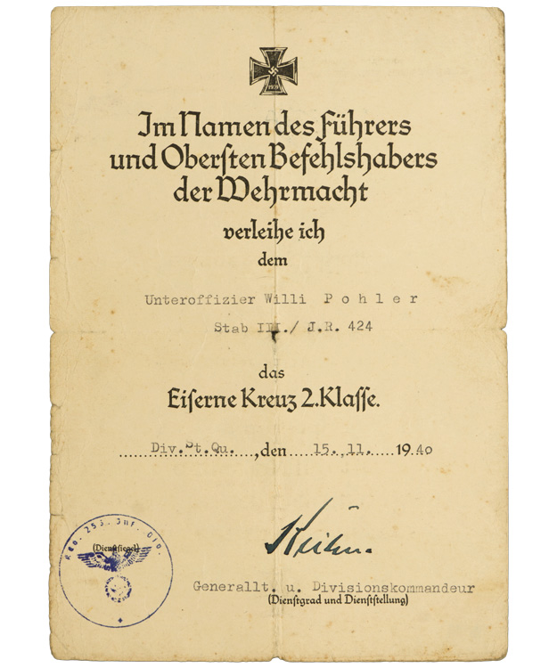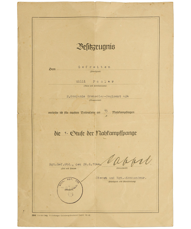 Fantastic grouping all to the same man! Close Combat in Bronze, Infantry Assault Badge Silver, EK2 (With envelope), Black & Silver Wound Badges, Russian Front Medal and two place ribbon badge. All with the original award documents plus photos of the original owner. Belonged to IR 424. Complete as photographed. Nice set!