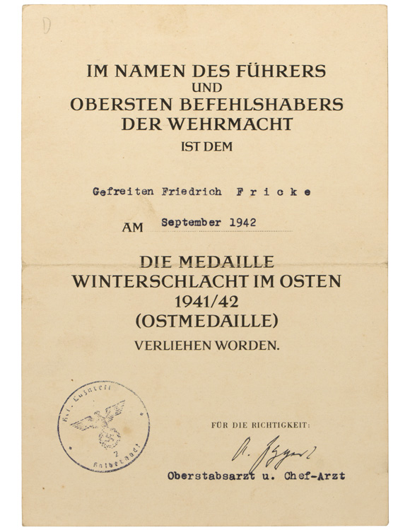 A named grouping belonging to a Corporal who served with Schw. Art. Abt. 430, Indepdent Army Unit who served in France and Russia. The unit wa attached to the 6. Army in Russia and surrendered in Stalingrad, but he was not with the unit at that time due to a severe wound from bomb shrapnel to his left leg on "26-6-42". He was medically discharged on "30-11-44". He was entitled to a Silver Wound Badge. Included are award documents for the Winter War Medal, Iron Cross 2nd Class, his discharge certificate and wehrpass (all entries are photographed).