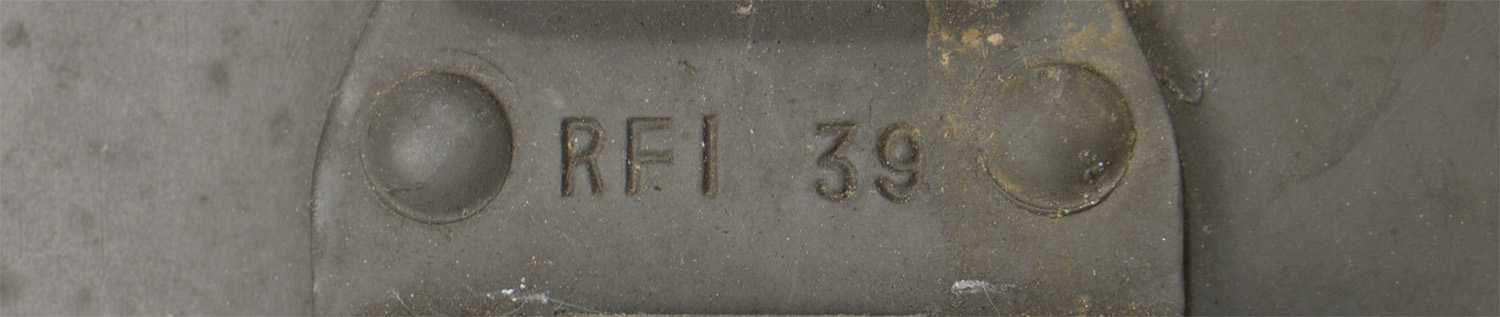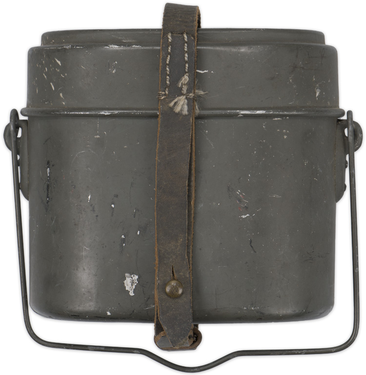 PHYSICAL DESCRIPTION: Standard issue, 1.7 liter capacity, field grey painted, kidney shaped, tooled, aluminum and steel construction mess kit. The kit has a removable top lid which serves double duty as a plate or frying pan. The removable top lid has a riveted on, hinged, fold back, steel handle with a raised lip to the bottom edge which secures the lid to the bottom of the mess kit body. Both the top and bottom edges of the hinged handle have raised, horizontal, strap retaining bars with central cut outs. Each side of the mess kit body has a small, riveted on, vertically oval, carrying handle mount with an extended, closed loop to secure the swivel, wire carrying/suspension handle. The wire carrying/suspension handle features a semi circular indentation to the top center allowing it to be suspended over a fire. Top is marked "RFI 39" and the bottom "RFI 39". Comes with a strap.