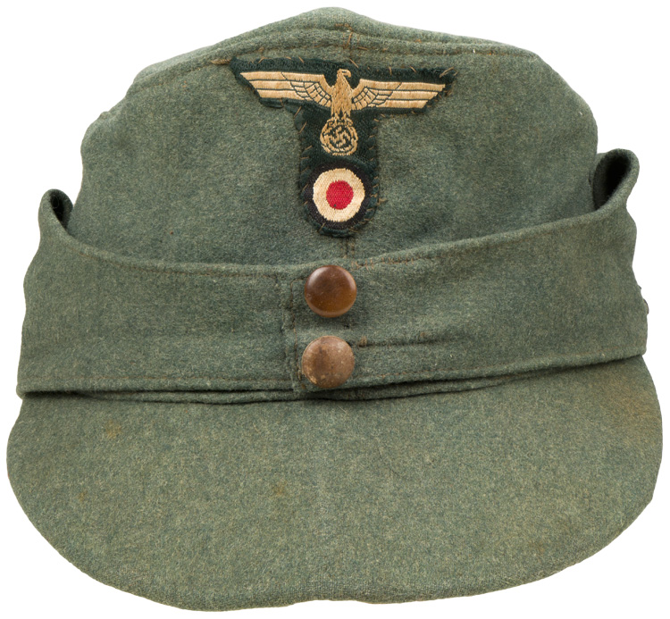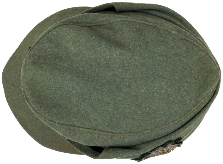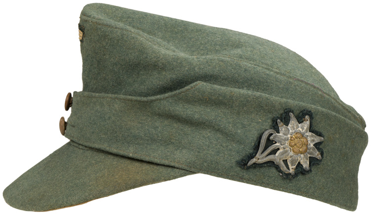 PHYSICAL DESCRIPTION: Field-grey, wool/rayon construction cap features fold down back and side panels with scalloped front edge and forward sides, held in the upward position at the front by two small mid-brown moulded bakelite buttons. Back and side panels were designed to be folded down to protect the wearers ears and neck and the scalloped front section could be secured with the buttons closed under the wearers chin. Buttons are ornamental, so the flap will not fold down (private purchase variant). Cap has a short cloth covered visor. Front center of cap features a machine woven, combined, national eagle in matte grey threads and national tri-color cockade on a woven green rayon, "T" shaped base. Insignia is handstitched to cap. Left side panel of cap has a 1939 pattern, silver washed, stamped alloy edelweiss with nine petals, two leaves, single stem and separate, gilt washed, stamen attached by two bent over prongs. Interior of cap is fully lined in light weight grey cotton/rayon. Size marked 53 with a faint makers mark. Original sweatband is present. Saw loads of period use and wear. Nice salty example.