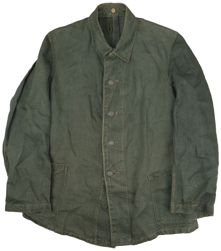 PHYSICAL DESCRIPTION: Mid-war, (circa 1942), reed green, cotton/rayon blend construction drill tunic with an HBT weave, features a vertical, five button front closure with a single metal hook and eye positioned at the neckline. The tunic has two, non-pleated hip pockets with straight edged button down flaps and no breast pockets. The reverse of the tunic has a short, central, vertical, tail skirt vent. The tunic has straight cut, non-adjustable sleeves. The tunic has no insignia, or any evidence that any was ever applied, as per regulations. The unlined interior of the tunic has horizontal, tunnel looped, fit adjustment drawstrings positioned at the reverse waistline. The front closure and exterior pocket buttons are all the removable, field-grey painted, pebbled alloy type secured by circular "S" rings. The collar liner buttons are the ersatz, tan, pressed cardboard type and appear to have their original stitching. The tunic is roughly size 36" chest.