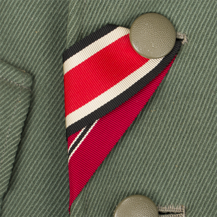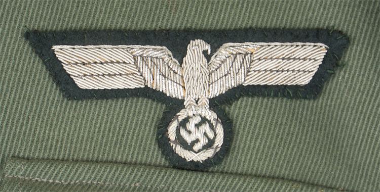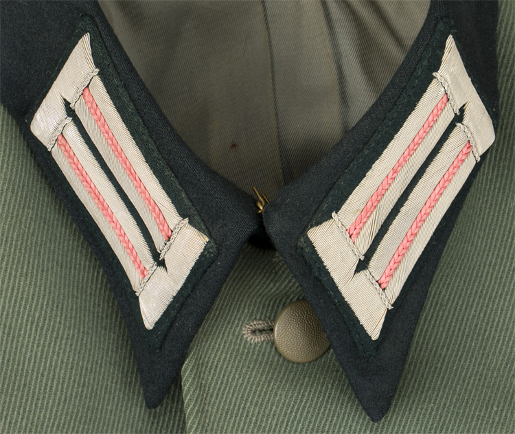 BACKGROUND: The development of the M36 field blouse can be traced back to April 1933 with the introduction of the first pattern field blouses which were a departure from the cut and style of tunics utilized in World War I. From its introduction until 1936 the field blouse underwent a couple of small modifications designed to enhance its performance, appearance and longevity. Modifications to the 1933 pattern field blouse began in December 1934 when the original field-grey basic cloth collar was altered to a field-grey badge cloth for a better appearance. In September 1935 the collar was altered again from the field-grey badge cloth to dark blue/green badge cloth. The final pre-war modification to the field blouse occurred in December 1936 with the addition of a partial lining to the interior breast and upper back panels to increase its wear-out time. Officers and certain senior NCO ranks were responsible for purchasing their own uniforms and as a result were allotted a clothing allowance through the army’s Kleiderkasse, (Clothing Account), system. The Officers and certain senior NCO’s could choose to purchase their uniforms from the armed forces clothing depots or to privately purchase garments of higher quality. Although enlisted personnel were issued their uniforms from government supplies they were also permitted to purchase privately tailored uniforms although the price may have been restrictive. On the field blouse and service tunic the waffenfarbe was generally displayed on the shoulder straps/boards and the collar tabs.