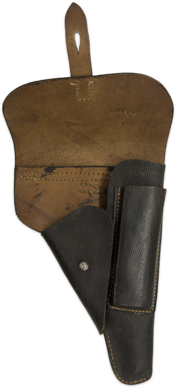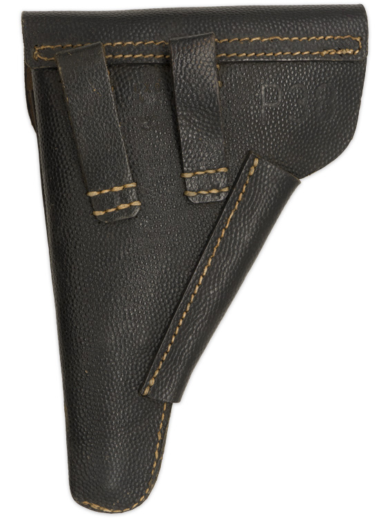 PHYSICAL DESCRIPTION: Second pattern, molded, blackened pebbled, leather construction, P38 "softshell" holster. The holster features a fold over top flap with a horizontal stitched hinge to the reverse and a stitched on vertical leather closure strap to the obverse. The top flap closure strap attaches to a natural steel stud that is situated on a fold back panel to the left hand side of the holster body. The holster body also has a stitched on, spare magazine pocket to the right front. The reverse of the holster has two slightly diagonally angled stitched on leather belt loops. The reverse of the holster is well marked with impressed designation, "P38", a Waffen-amt stamp and the manufacturers three letter code "cxb".