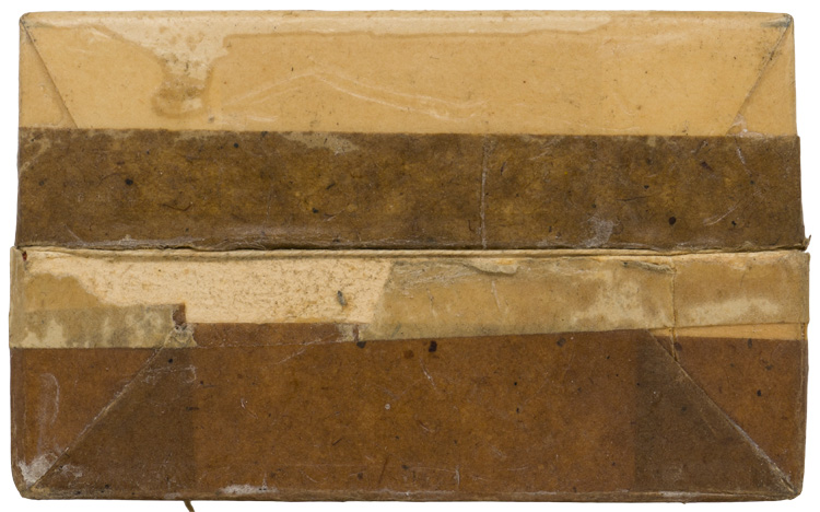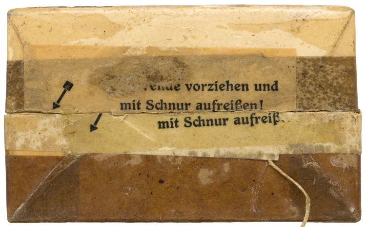 PHYSICAL DESCRIPTION: Roughly, 9.5cm x 6cm x 3cm, two piece, natural tan cardboard box with a tan wax paper covering housing a natural hardwood detonator case. The removable, friction fit, top of the box has a glued on, white paper label with black printed script that includes the contents, "15 Sprengkapseln Nr.8", (15 Detonators {Model} number 8). Box has an additional glued on off white paper label with black printed opening instructions, "Schnurende vorziehen und mit Schnur aufreißen!", (Pull the end of the string forward and tear open). The string has been removed. The carved natural hardwood detonator case has a slotted top with an inset, carved, removable, slideable lid with a dove tailed bottom edge. Removing the lid reveals fifteen small drilled circular holes for inserting the detonators.
