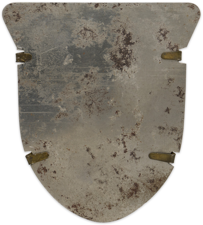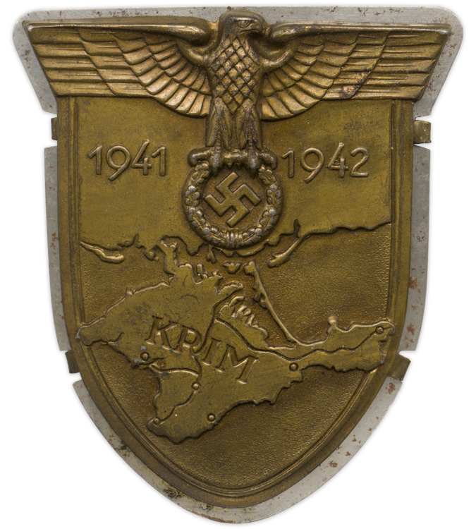 PHYSICAL DESCRIPTION: The award is in the form of a vertical, die stamped, magnetic sheet metal construction, shield with a bronze wash featuring a large embossed national eagle with out-stretched wings, clutching a wreathed, canted, swastika in it’s talons, to the top center, situated above an embossed, stylized, map of the Krim peninsula with the embossed dates, "1941-1942", and the impressed location, "Krim". The recessed "water" surrounding the peninsula has a subtly pebbled, background field. The edge of the shield has a fine, embossed, line and a stepped down outer edge. Original backing plate is present. Badge is Friedrich Orth prouction example.