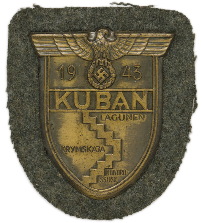 PHYSICAL DESCRIPTION: Die stamped, magnetic construction shield with a bronze wash featuring an embossed, stylized, national eagle with out-stretched wings, clutching a wreathed, canted, swastika in its talons, to the top center, with the swastika flanked by the embossed date, "1943". The eagle sits atop a horizontal bar with the embossed script, "Kuban". The bottom portion of the shield features an embossed serrated defensive line with the impressed, named, locations of the major engagements, "Lagunen, Krymskaja", and "Nuworo-ssijsk". Prongs and plate all complete.