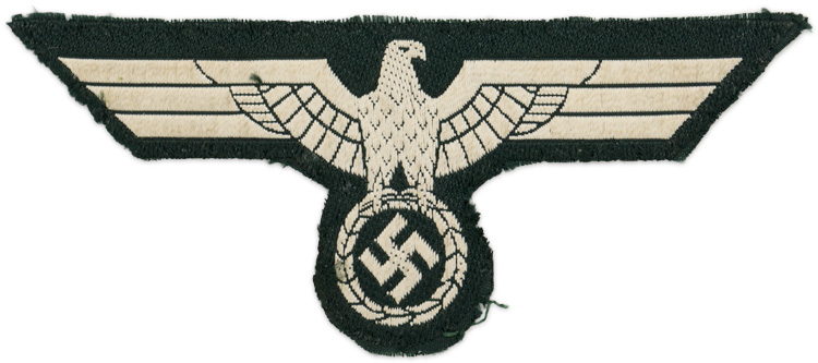 BACKGROUND: The German army originally adopted a slightly modified version of the NSDAP’s national eagle by order on February 17TH 1934, with instructions to have it applied to all steel helmets, visor caps, and tunics by May 1ST 1934. Later amendments to the introductory order stipulated that the national eagle was also to be worn on all field caps, the sports uniform and the black panzer wrap. The eagle came in three distinct designs with two having slightly different out-stretched wings and the third with down-swept wings. Generally officer’s ranks utilized hand or machine embroidered breast eagles while EM/NCO’s ranks utilized machine embroidered or woven breast eagles. The early standard issue EM/NCO’s M36 breast eagles were in white threads and were to be abolished in 1939 to be replaced with a less visible grey M39 breast eagle but the changeover was never fully completed.