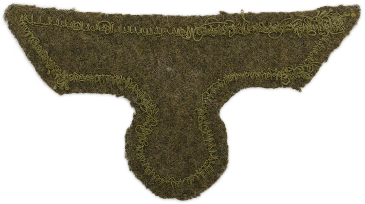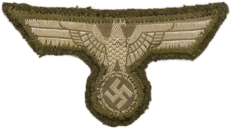 The German army originally adopted a slightly modified version of the NSDAP’s national eagle by order on February 17TH 1934, with instructions to have it applied to all steel helmets, visor caps, and tunics by May 1ST 1934. Later amendments to the introductory order stipulated that the national eagle was also to be worn on all field caps, the sports uniform and the black panzer wrap. The eagle came in three distinct designs with two having slightly different out-stretched wings and the third with down-swept wings. Generally officer’s ranks utilized hand or machine embroidered breast eagles while EM/NCO’s ranks utilized machine embroidered or woven breast eagles. The early standard issue EM/NCO’s M36 breast eagles were in white threads and were to be abolished in 1939 to be replaced with a less visible grey M39 breast eagle but the changeover was never fully completed.PHYSICAL DESCRIPTION: Early, M36 varient pattern, machine woven breast eagle in white celleon threads on a cut-out, wool base.