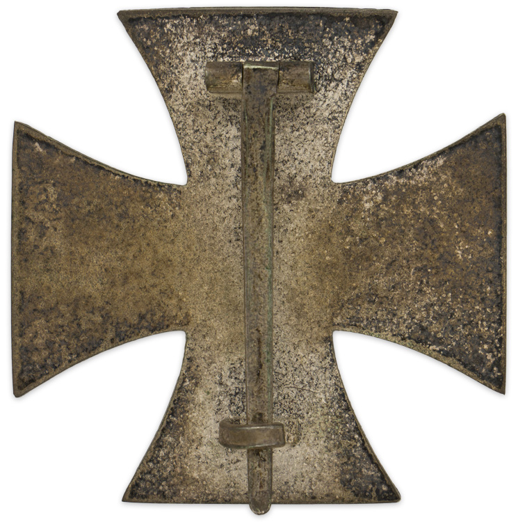 PHYSICAL DESCRIPTION: 1939 pattern, private purchase, die struck, three piece, iron and nickel/silver plated alloy construction Pattée style cross with a single piece iron core and a two piece alloy frame. The obverse of the award features an embossed, central, canted, swastika with the re-institution date, "1939", to the bottom arm. The swastika stands out in nice, high relief while the date is somewhat lower. The plain reverse has a solid, soldered, block type hinge, a broad, tapering vertical pin and a catch all intact. The reverse of the pin is well marked with impressed manufacturer’s LDO code, "L/52", within a rectangular recess indicating manufacture by C. F. Zimmermann of Pforzheim. Scarce to find with the single "L" marking, most are double marked.