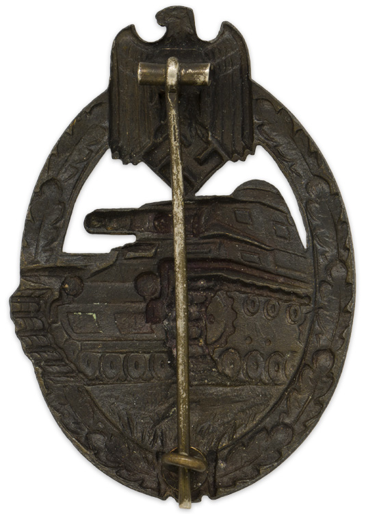 PHYSICAL DESCRIPTION: Nicely detailed, die stamped, hollow backed, alloy award with a bronze washed finish is in the form of an embossed, vertically oval, oak-leaf wreath with a Wehrmacht style eagle with down-swept wings, clutching a canted swastika in it’s talons, superimposed to the top center, encompassing the cut-out, forward profile of a tank. The wreath, eagle and tank all show nice detailing. The bronze wash is retained about 90% with small spots of wear to the base tombac alloy. The reverse of the badge is a mirror image of the obverse. The reverse has a solid, soldered hinge, a thin, round, vertical pin and a soldered catch all intact. The badge has no visible manufacturer’s markings but is a rare CE Juncker example.