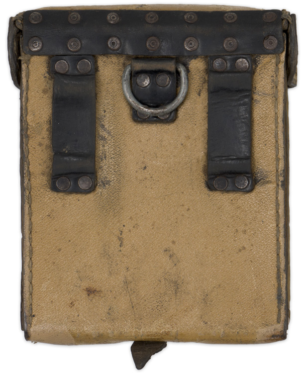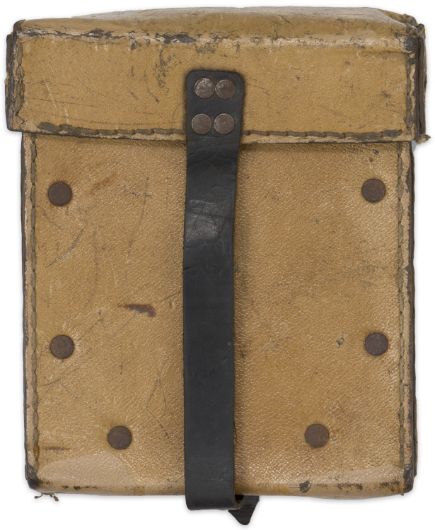 PHYSICAL DESCRIPTION: Grained, simulated ordnance tan leather, Presstoff construction MG34/42 gunners pouch with leather, steel and alloy fittings. The pouch has a fold over top flap with a stitched, horizontal leather hinge to the reverse and a stitched on, vertical, leather closure strap with a single cut out stud eyelet to the obverse. The closure strap affixes to a steel stud situated on the bottom of the pouch. The pouch has eight, small puncture rivets in a circular pattern to the front body designed to secure the internal frame panel. The pouch has an additional two steel rivets to the bottom and two rivets securing a small aluminum panel to the upper right side to secure internal panels and a spring steel clip for storing of the contents. The reverse of the pouch has two, stitched on, vertical leather belt loops and a central, leather reinforced steel "D" ring. The internal spring steel retaining clip, a single leather pocket and a single panel are intact.