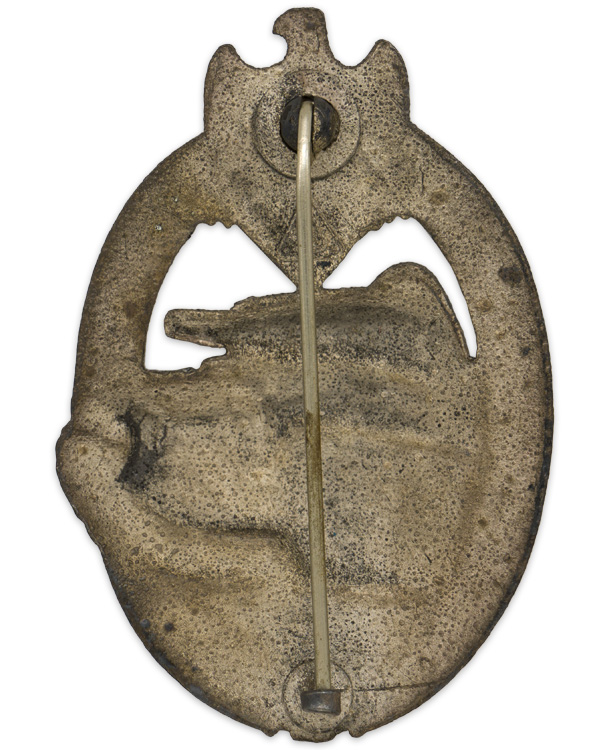 PHYSICAL DESCRIPTION: Nicely detailed, die struck alloy, partially scooped backed, badge with a polished silver washed finish. The badge is in the form of an embossed, vertically oval, oak-leaf wreath with a Wehrmacht style eagle with down-swept wings, superimposed to the top center, encompassing the forward profile of a tank. The polished silver finish is retained about 80% and is still fairly bright. The reverse of the badge has scooped depressions to the tank barrel and body. The reverse has a soldered ball hinge inset into a circular recess with raised retaining lips, a thin round vertical pin, and a soldered catch on an inset circular base plate all intact. The reverse is well marked with embossed, stylized, overlapping manufacturer's initials within a triangular border, "AS", indicating manufacture by Adolf Scholze. Complete with original issue box and tissue paper!