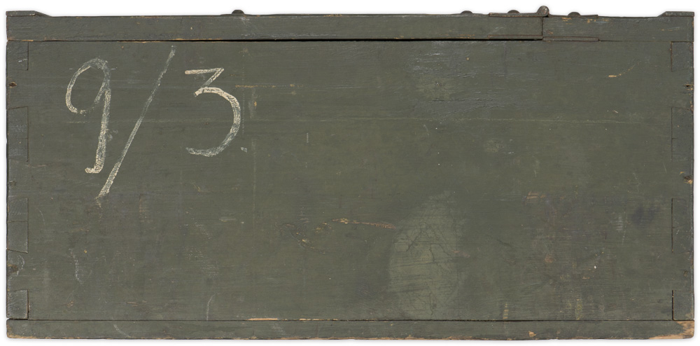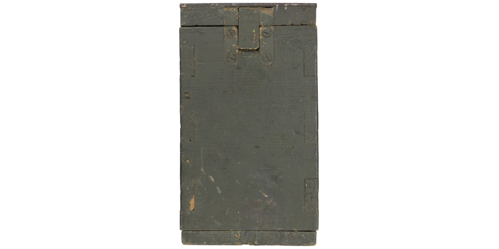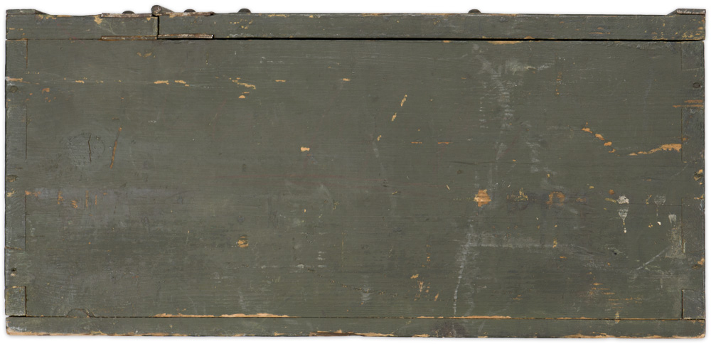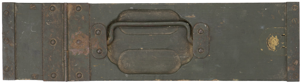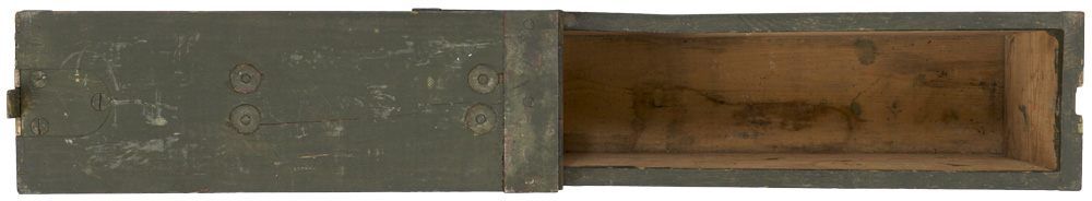 A 10cm x 18cm x 38.5cm, green painted, wooden box with a recessed, bent wire carrying handle, hinged top lip and working side release mechanism. No apparent markings with the exception of “9/3" which is handwritten to the side panel. The crate shows typical usage and wear to the paint and wood surface.