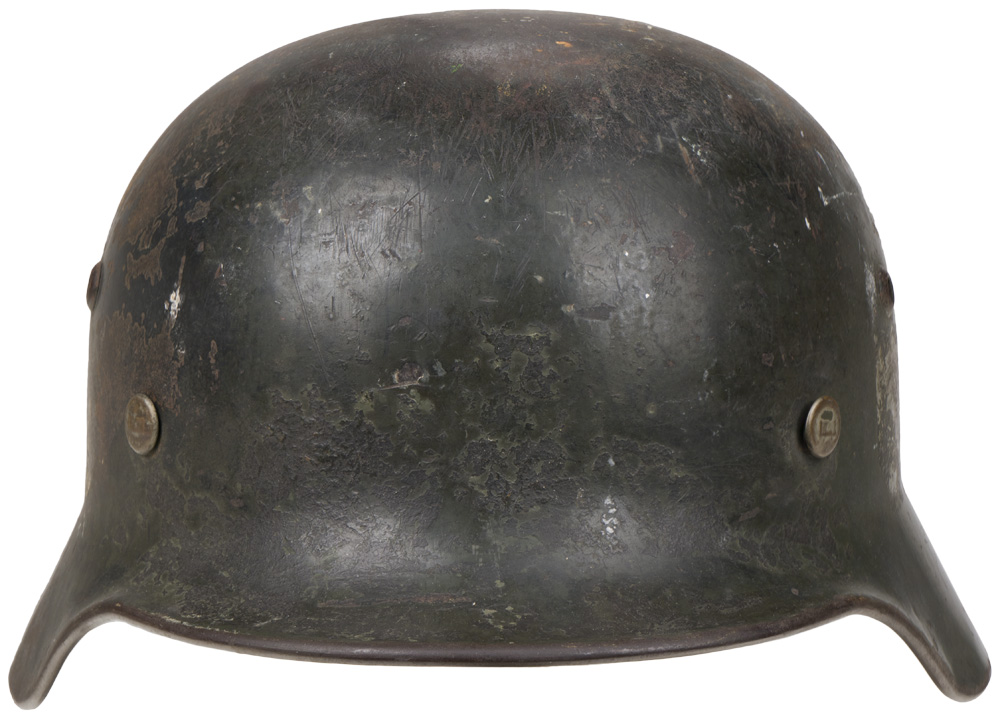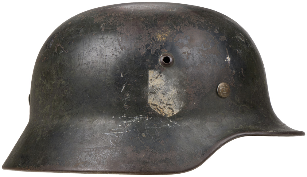 BACKGROUND: The first "modern" steel helmets were introduced by the French army in early 1915 and were shortly followed by the British army later that year. With plans on the drawing board, experimental helmets in the field, ("Gaede" helmet), and some captured French and British helmets the German army began tests for their own steel helmet at the Kummersdorf Proving Grounds in November, and in the field in December 1915. An acceptable pattern was developed and approved and production began at Eisen-und Hüttenwerke, AG Thale/Harz, in the spring of 1916. These first modern M16 helmets evolved into the M18 helmets by the end of WWI. The M16 and M18 helmets remained in usage through-out the Weimar Reichswehr era and on into the early years of the Third Reich until the development of the smaller, lighter M35 style helmet in June 1935. In an effort to reduced construction time and labor costs minor modifications were introduced in March 1940 resulting in the M40 helmet. Further construction modifications were undertaken in August 1942 resulting in the M42 helmet. Originally the Third Reich national tri-color helmet decal was introduced on March 14TH 1933 for wear on the left side of the helmet to replace the Reichswehr era state shield insignia. Regulations of February 17TH 1934 introduced the Wehrmacht eagle decal and the national tri-color decal was shifted to the right side of the helmet with the Wehrmacht eagle decal positioned on the left hand side. Regulations of March 21ST 1940 dictated that the national tri-color decal was to be removed from all helmets and further regulations of August 28TH 1943 abolished the Wehrmacht eagle decal and dictated that it was also to be removed from all helmets although the directives were not completely adhered to.