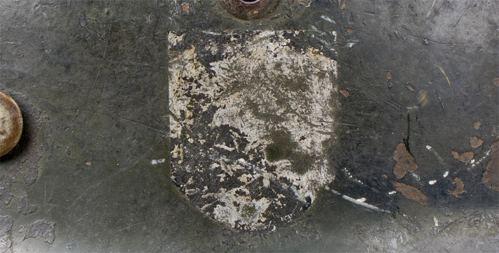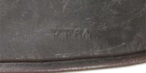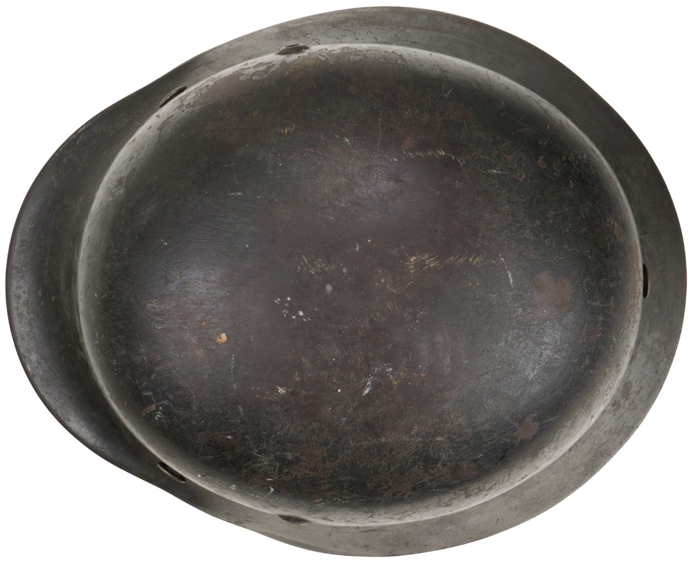 PHYSICAL DESCRIPTION: The stamped, sheet steel construction helmet retains a good portion of its original smooth feldgrau paint. Both decals are now mostly worn off. The interior of the helmet has a M31 leather liner with all eight of its fingers intact. The liner’s drawstring is present. The interior reverse neck guard apron is serial/lot number stamped, "3660", and the interior left side apron is stamped with the manufacturers code and size "EF64" indicating manufacture by Emaillierwerk, AG Fulda, size 64. Nice combat worn worn and used example.