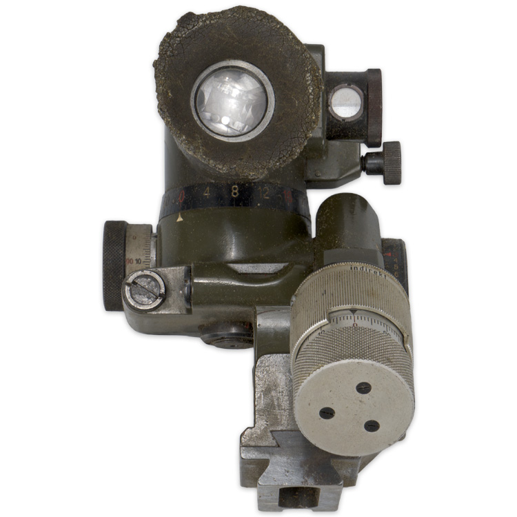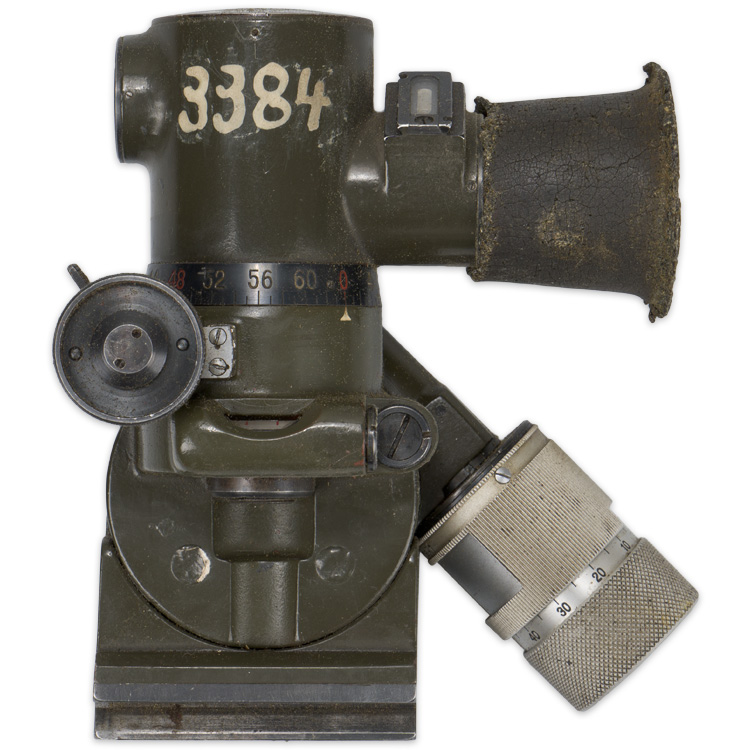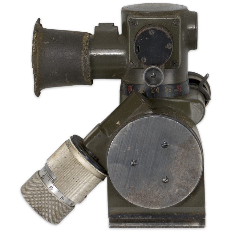 PHYSICAL DESCRIPTION: Tooled alloy and steel construction ZF34 sight with natural aluminum and blued fittings retains about most of its original field grey and black paints. Maker marked to “cme”. Decent optics. Complete with original box.