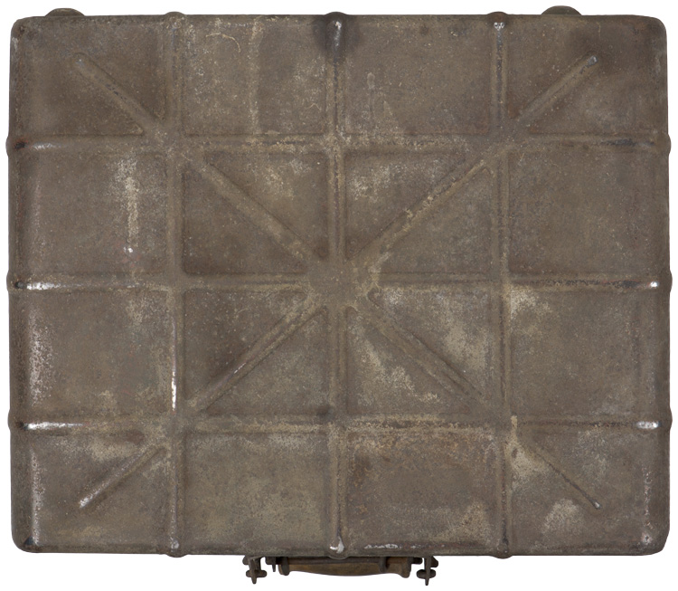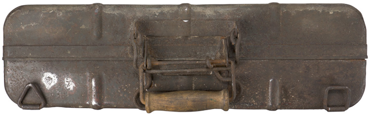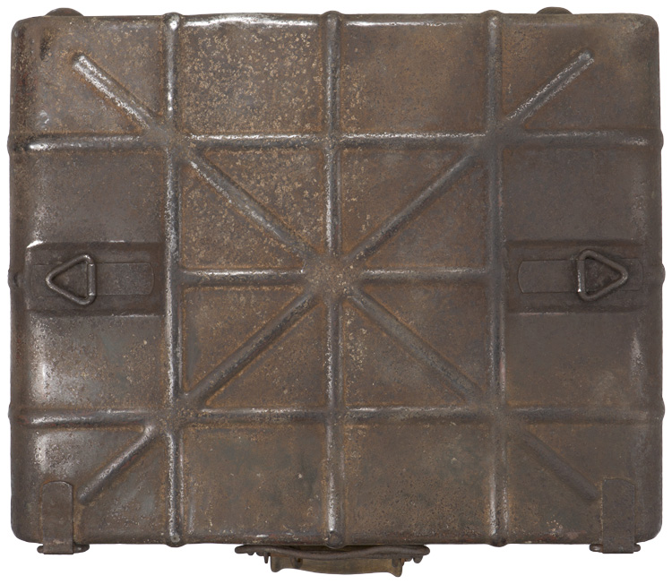 PHYSICAL DESCRIPTION: Roughly, 36.5cm tall, 48cm wide, 14cm thick, field grey, stamped and tooled magnetic sheet metal construction M24 stick grenade carrying case features a brazed, staggered, bar hinge to the bottom edge and a brazed on, folding, heavy wire, pressure lock and quick release bar with a swivel, turned hardwood carrying handle to the top edge. The case has three vertical, three horizontal and two diagonal, evenly spaced, raised, stamped, strength reinforcement ribs to each side. One side of the case also has three triangular, and one rectangular, brazed on, steel attachment "rings" designed for carrying straps. The exterior of the case retains a good portion of it’s field grey paint with light to moderate surface spotting and pitting.