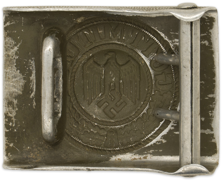 PHYSICAL DESCRIPTION: Early, (circa 1936-1940), injection molded construction, natural aluminum box buckle with a pebbled background field and a slightly domed, embossed central motif. The central motif features an embossed Wehrmacht style eagle with down swept wings on a subtly pebbled field to the center, encompassed by an embossed oak-leaf cluster to the bottom and script, "Gott Mit Uns", (God with Us), to the top. The oak-leaf cluster and script are on a ribbed background field and are encircled by both an inner and outer simulated twisted rope border. The reverse has the integral, raised, slotted buckle catch and separate prong bar and prongs all intact. The buckle comes complete with a roughly, 45mm wide, 90cm, long, woven, khaki/olive canvas web construction waist belt with an olive drab painted, steel buckle catch and a web retaining tongue both intact. The buckle catch end of the belt is folded over and machine stitched to the reverse to secure the catch in place. The canvas tongue has it’s original stitching and seven pair of parallel, length adjustment buckling eyelets.