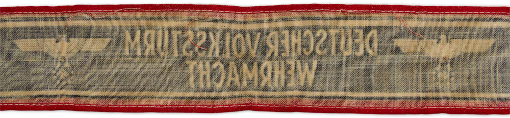 PHYSICAL DESCRIPTION: Official pattern armband with a multi-colored, printed design featuring horizontal, red bordered, top and bottom edges and a black/white/black center stripe. The armband has white printed Latin script, "Deutscher Volkssturm Wehrmacht", (German People’s Militia Armed Forces), in two lines, to the front center which is flanked by a white national eagle, with out-stretched wings, clutching a wreathed, canted, swastika to either side.