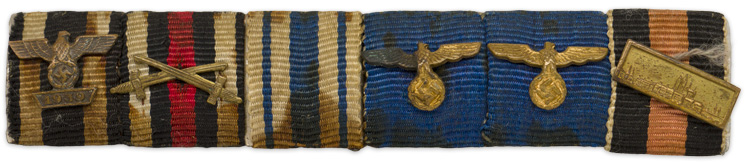 The wear of Awards, Medal Bars and Ribbon Bars were addressed in regulations of April 28TH 1937 and followed established directives that had been previously laid down. When an award was instituted the introductory orders would prescribe the proper form of wear with most of the awards being permitted to be grouped together on a medal or ribbon bar. The medal bars were intended for wear on the walking-out dress and formal uniforms, while the ribbon bars were intended for all other forms of dress. Strict regulations listed the required order in which ribbons awards were authorized to be worn on the ribbon bar.PHYSICAL DESCRIPTION: The six place ribbon bar with a 1914 EK2 (Spange), 1914-18 Cross of Honor, Three Long Service ribbons and a Commemorative Medal of October 1ST 1938 ribbon with Prague Castle bar cypher. (Prague bar is a little loose). Complete with original pinback device.