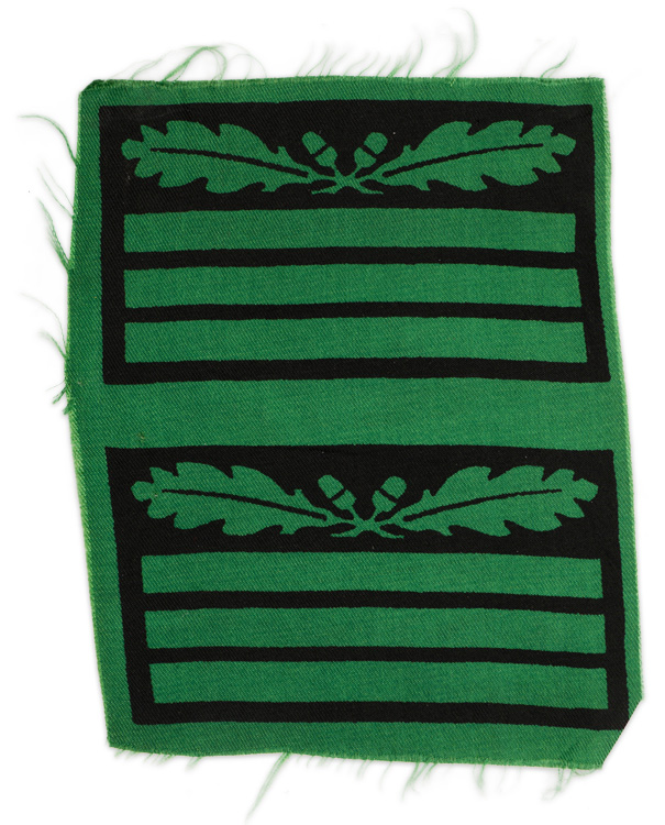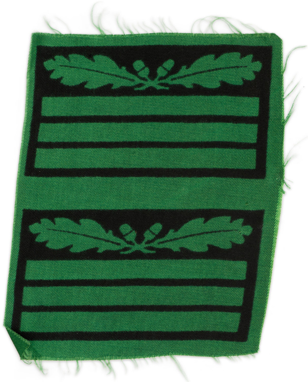 PHYSICAL DESCRIPTION: The insignia consists of roller, screen printed, rayon construction base featuring a camouflage Hauptmann’s rank insignia having three green, horizontal, bars positioned below dual, horizontal, oak-leaves with two acorns, on a black printed rayon field. Two piece still attached.
