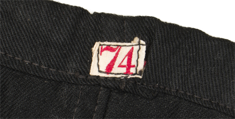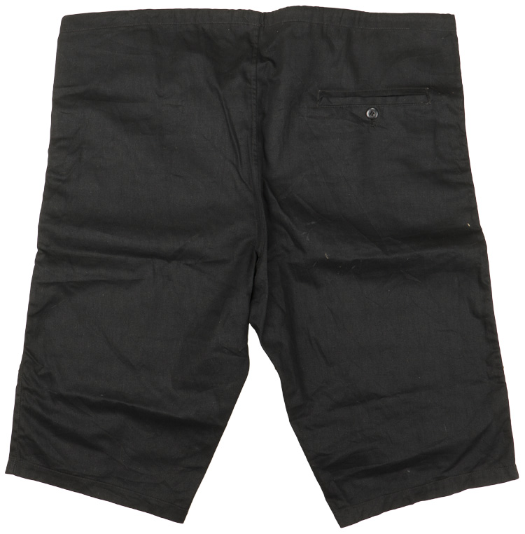 PHYSICAL DESCRIPTION: Ribbed, woven black cotton/tricot construction sports shorts feature a tunnel looped, black cotton, fit adjustment drawstring with an HBT, (Herring Bone Twill), weave to the waistband and dual-ply hemmed legs. Single rear pocket with button. Size marked 74 (cm). Nice clean condition.