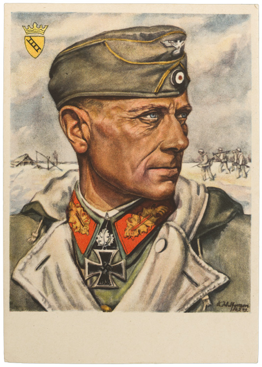BACKGROUND: Artwork, as a propaganda tool, was widely used during the Third Reich and Hitler’s own humble artistic background also helped foster a general interest in German art. Many art exhibitions were held through-out German during the time period with the largest being held annually, ever summer from 1937 to 1944, at the German House of Art in Munich. As early as 1938 the OKW, Oberkommando der Wehrmacht, (High Command of the Armed Forces), actively began recruiting artists who were assigned to a units Propaganda Company along with photographers and journalists. By the end of the war almost two hundred war artists had served in the Wehrmacht. One of the most prolific, and as a result, one of the best known German war artists was Feldwebel Wolfgang Willrich. Willrich a WWI veteran, had volunteer for military service prior to the outbreak of WWII but had been rejected on the basis of his age, (42), and was assigned to Landwehr I as a trained reserve. Through his personal friendship with Erwin Rommel Willrich was able to secure a position in the OKH visual arts section of the Propaganda department. In this position Willrich painted and drew numerous personalities and regular soldiers in all branches of service through-out the war. Many pieces of his artwork were featured on assorted series of postcards developed by the "VDA, "Volksbund für das Deutschtum im Ausland", (National League for Germans Abroad), among others. The VDA was originally a pre-war organization formed to assist German nationals living in foreign countries and during the Third Reich era the VDA was taken over by the NSDAP and placed under the jurisdiction of the SS. In mid-1942 the OKH decided to have portraits of all the Knight’s Cross of the Iron Cross holders.