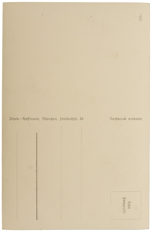 A standard size, black and white studio portrait photograph postcard that has not been posted or used. Portrait photograph taken by Hoffmann.