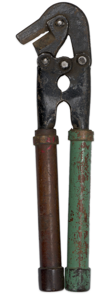 PHYSICAL DESCRIPTION: Roughly, 39cm tall, tooled steel and sheet metal construction wire cutters with bakelite grips (one painted green). The wire cutters consist of dual, tubular, sheet metal handles fitted with mottled tan bakelite grips with additional raised mottled brown bakelite end pieces to prevent slippage. The tubular sheet metal handles have a central swivel hinge and an additional two swivel hinges which secure them to the cutting head. The uniquely shaped, curved angle cutting head has an additional swivel hinge with dual, downwardly angled cutting blades. Blades are very worn from decades of use. Comes with a excellent original case.