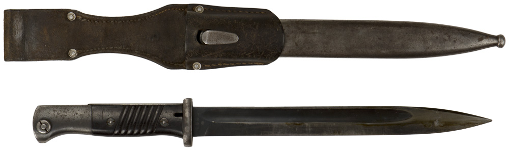 BACKGROUND: The K98 bayonet was a modification of the already modified S84/98 bayonet that had been originally developed in 1915. Manufacture of this new modified bayonet began in 1934 with mass production beginning in 1936. The K98 bayonet was a standard issue item and was accompanied by a bayonet frog to be worn on the reverse left side of the weight bearing waist belt. The K98 bayonet remained the standard issue bayonet through-out the war with minor manufacturing variations. As the war continued the quality of the bayonets deteriorated and in mid-1944 most manufacturers discontinued producing the bayonet to concentrate on producing other essential war materials.