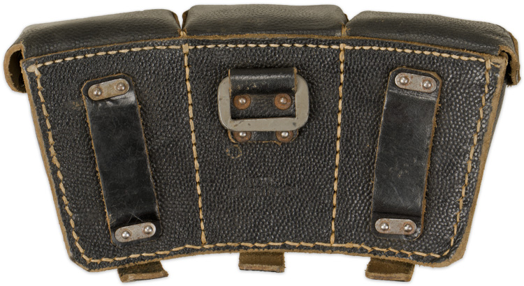 PHYSICAL DESCRIPTION: Later pattern, blackened pebbled leather construction, three compartment ammo pouch. Separator strips are complete. Rbnr# marked. Nice!