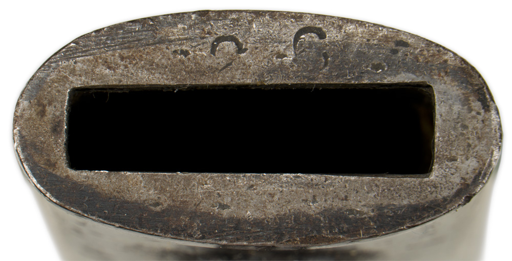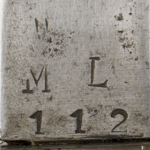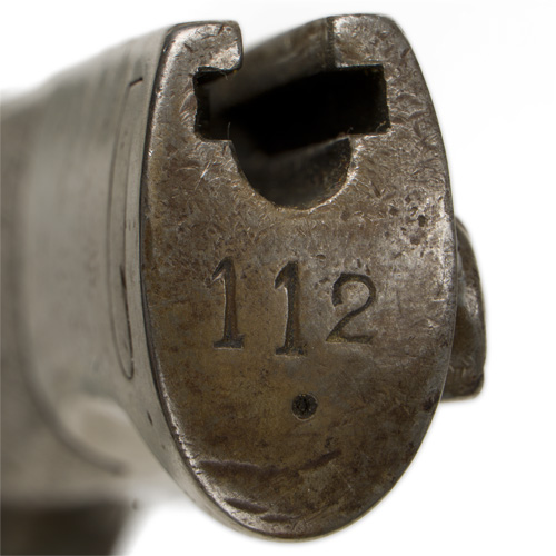 PHYSICAL DESCRIPTION: Roughly 25cm long, drop forged, steel construction blade with wide fullers. Blade retains most it's original bluing. Marked "ML" "112". Stud functions well. The painted scabbard is marked to the throat with a faint number.