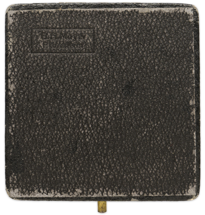 PHYSICAL DESCRIPTION: Injection molded, zinc construction, solid backed badge with a gilt finish. The standard issue, 1939 pattern badge features an embossed M35 pattern helmet with a high relief, canted, swastika to the center superimposed over crossed swords on a pebbled background field, encompassed by an embossed, vertically oval laurel leaf wreath. The plain solid reverse has an integral hinge, a thin round vertical pin and an integral catch all intact. The reverse is well marked with the embossed manufacturers numerical code, "26", indicating manufacturer by B. H. Mayer’s Kunstprägeanstalt of Pforzheim. Comes with its original case. Case in nicely marked to B. H. Mayer on the bottom. Scarce to see matching maker marked case and badge.