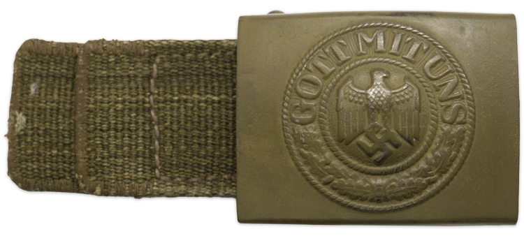 PHYSICAL DESCRIPTION: 1940 pattern, olive drab painted, die stamped steel construction, combat box buckle features a smooth outer field with a high relief, embossed Wehrmacht eagle with down swept wings, clutching a canted swastika in it’s talons, to the slightly domed center, encompassed by an oak leaf cluster to the bottom and script, "Gott Mit Uns", (God With Us), to the top. The oak leaf cluster and script are on a ribbed background and are encircled by both an inner and outer simulated twisted rope border. The buckle retains a good portion of it’s original olive drab paint. The reverse of the buckle is a mirror image of the obverse. The reverse has the brazed buckle catch, prong bar and prongs all intact. The prong bar has a woven, olive drab canvas web tab stitched around it. The dual ply web tab has tightly stitched reinforcements to the ends.