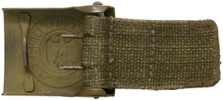 BACKGROUND: Military belts and their corresponding buckles date back centuries and were initially designed for attaching swords and daggers. In 1847 a new innovative box buckle with a quick release catch and corresponding belt were introduced which resulted in a Prussian, Hauptmann Virschow, initiating a new method of carrying personal equipment with the belt and shoulder straps supporting the majority of the weight. This system, with modifications, remains in use in most of the armies in the world to this day. During the Third Reich there was a prescribed form of wear of the belt and buckle with the buckle being positioned on the right side and the corresponding buckle catch on the left side. On January 24TH 1936 a new pattern EM/NCO’s belt buckle was officially introduced to replace the previously worn Weimar Reichswehr era, (National Defence Force, Circa 1919 1933), belt buckle. The basic design of the Reichswehr buckle was retained with the addition of the new Wehrmacht, (Armed Forces), style national eagle. This pattern buckle was worn through out the Third Reich period with minor manufacturing variations and different colored finishes. The colored finish was determined by regulations depending on what form of uniform it was to be worn with. Of Note: Originally military buckles produced under government contract had the addition of a leather, (canvas web for tropical buckles), tabs which were designed to help support the ammunition pouches and prevent slippage but regulations in 1942 discontinued the tabs to preserve leather although the directive was not completely adhered to. In late 1940, with the impending German entrance into the North African campaign, tropical uniforms and equipment were quickly developed and issued in time for DAK, Deutsches Afrika Korps, (German Africa Corps), personnel’s arrival in Tripoli in February 1941. Due to the extreme climate in North Africa the OKW, Oberkommando der Wehrmacht, (High Command of the Armed Forces), decided to replace the standard continental leather equipment items with canvas web construction equipment items in the belief that they would be better able to withstand the climate. Of Note: Eventually, due to leather shortages, many of the tropical uniform and equipment items would be issued to personnel serving in southern areas of continental Europe and other theatres of battle.