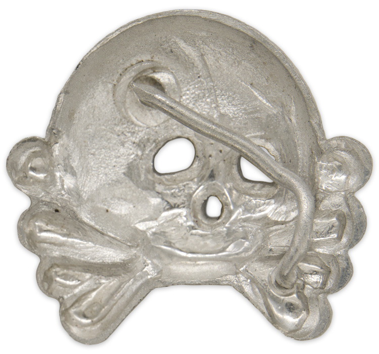 PHYSICAL DESCRIPTION: Aluminum construction, Prussian "Danziger" style skull and crossbones feature circular eye and triangular nose cut-outs, embossed cranium detailing and dual rows of teeth with no bottom jaw. The skull has a subtly pebbled background field and the crossbones extend outwards from either side. One of the two original prongs remain.