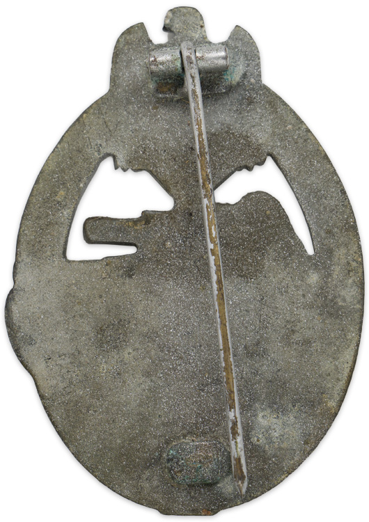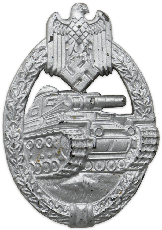 PHYSICAL DESCRIPTION: Die struck alloy/zinc construction, solid backed, badge with a silver washed finish features a vertically oval oak leaf wreath with a Wehrmacht style eagle with down swept wings, superimpose to the top center, encompassing the cut out, forward profile of a tank. Hinge and pin are complete, catch is