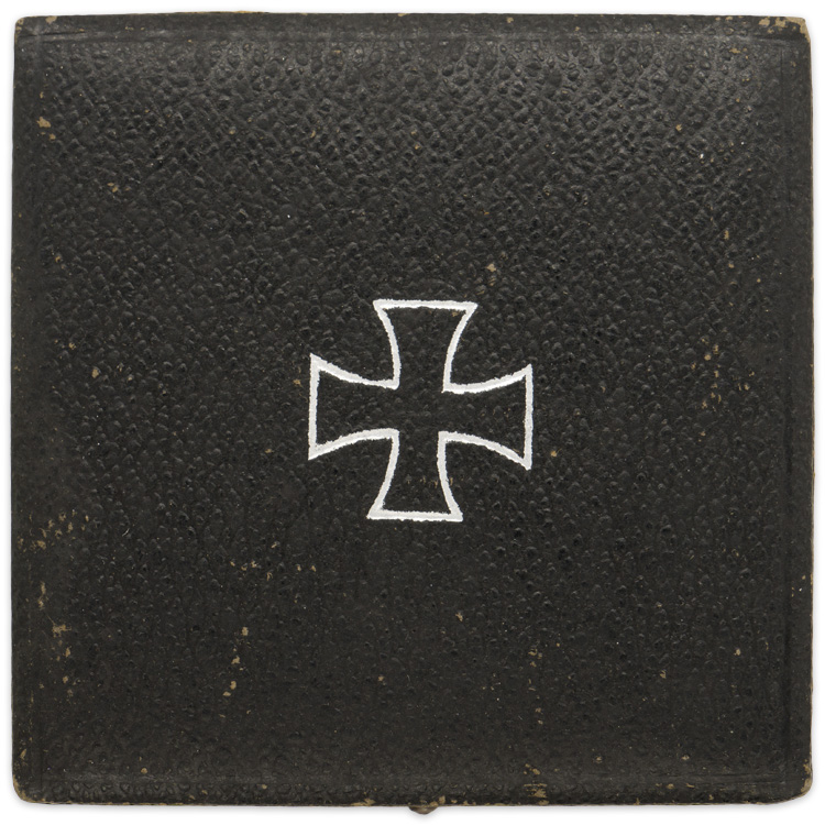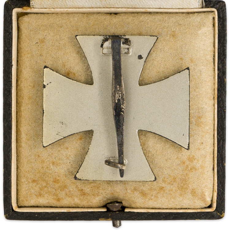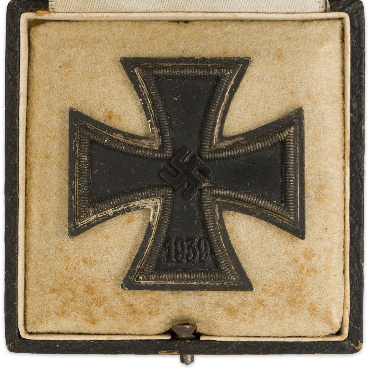PHYSICAL DESCRIPTION: 1939 pattern, die struck, three piece, iron and alloy construction Patté style cross with a single piece iron core and two piece alloy frame. The obverse of the award features an embossed, central, canted, swastika with re-institution date, "1939", to the bottom arm. The swastika is in nice high relief while the date is somewhat lower. The award has a plain reverse. The plain reverse of the award has a solid, soldered hinge, a broad, thick, tapered, vertical pin and catch all intact. The pin is well marked with the embossed manufacturer’s numerical code within a rectangular recess "6.", indicating manufacture by Fritz Zimmermann of Stuttgart. Nice original case. The latch on the case does not seem to catch, but otherwise fine. Rare maker.