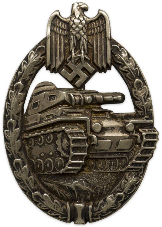 PHYSICAL DESCRIPTION: Nicely detailed, die stamped, hollow backed, alloy construction award with a nickle/silver plate. The badge is in the form of an embossed, vertically oval, oak-leaf wreath with a Wehrmacht style eagle with down-swept wings, clutching a canted swastika in it’s talons, superimposed to the top center, encompassing the cut-out, forward profile of a tank. The wreath, eagle and tank all show nice detailing. The reverse of the badge is a mirror image of the obverse and has a crimped, soldered, hinge, a thin round vertical pin and complete catch. Variant from C.E. Juncker, Berlin. Rare badge!