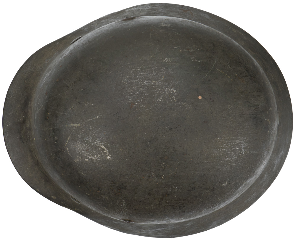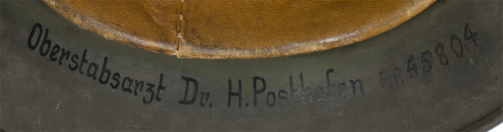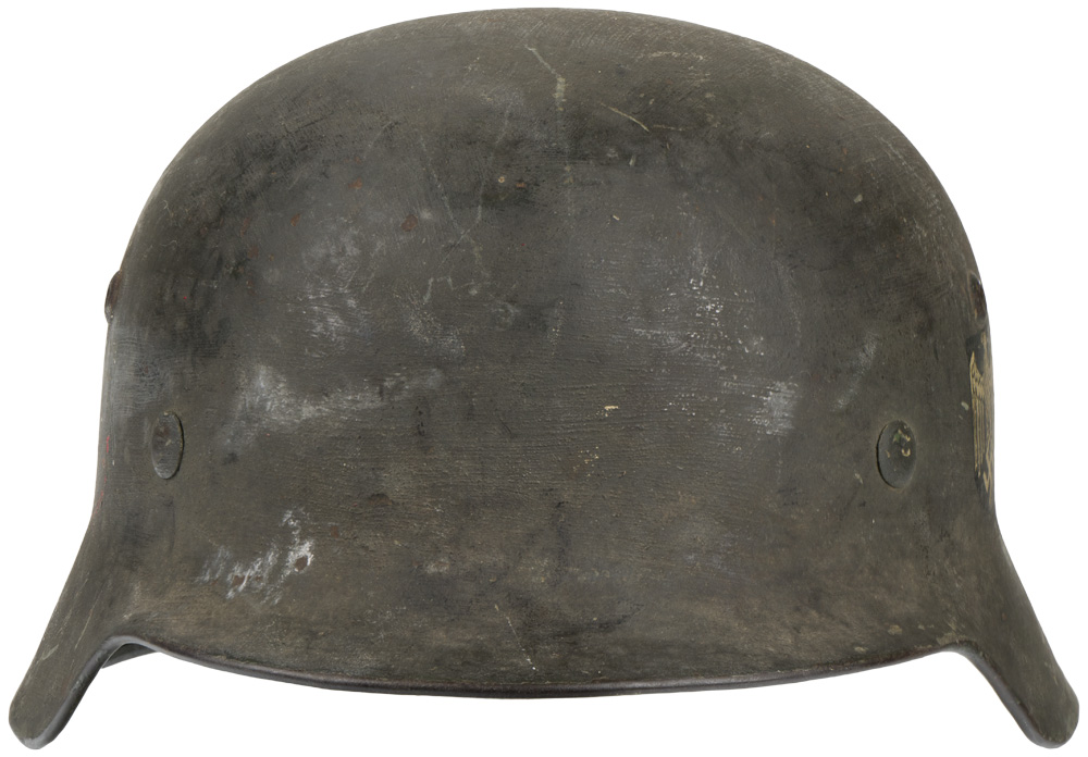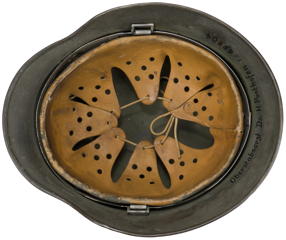 PHYSICAL DESCRIPTION: The stamped, sheet steel construction helmet most of its original feldgrau overpaint. The left side of the helmet has a Wehrmacht eagle shield decal which is retained 95%. The right side of the helmet has a national tri color shield decal which has been over painted in accordance to regulations. All three liner retaining rivets and both inserted ventilation bushings are all intact. The interior of the helmet has its M31 leather liner with all eight fingers and the original tie string intact. The interior reverse neck guard apron is serial/lot number stamped, "3628", and the interior left side apron is stamped with the manufacturers code and size, "ET66", indicating manufacture by Eisen und Hüttenwerke, AG Thale/Harz, size 66. Original Doctors name and Feldpost Number hand painted to the inside!