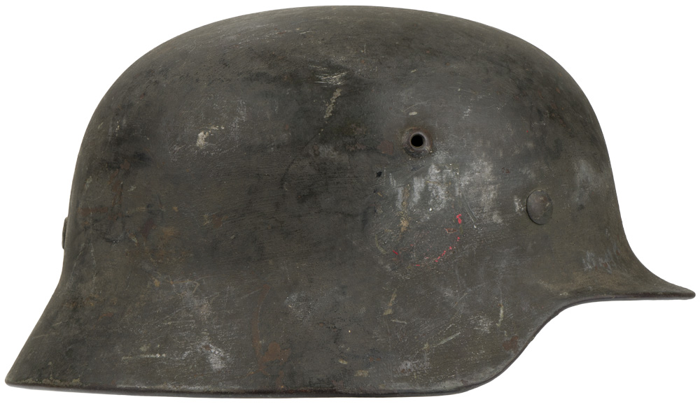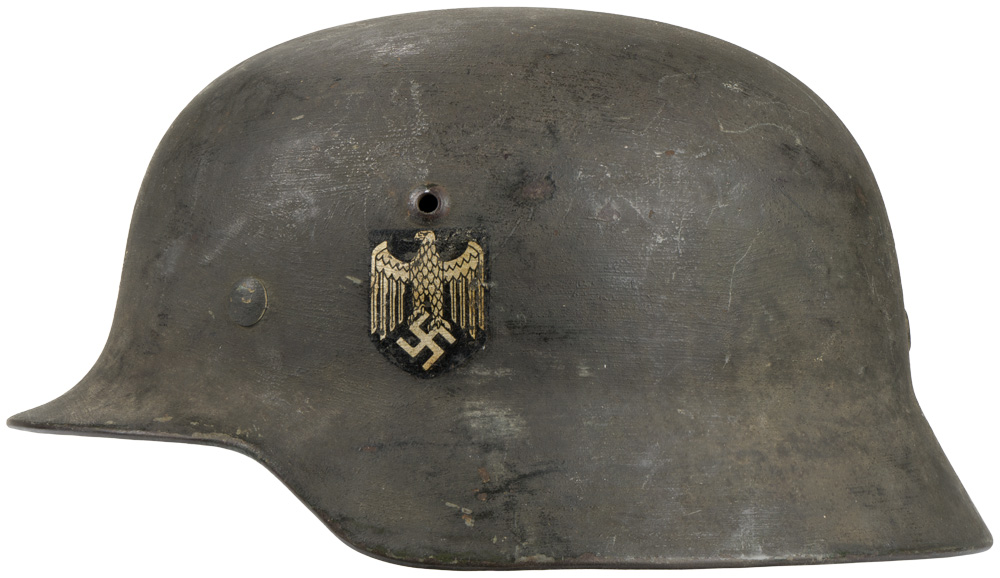 BACKGROUND: The first "modern" steel helmets were introduced by the French army in early 1915 and were shortly followed by the British army later that year. With plans on the drawing board, experimental helmets in the field, ("Gaede" helmet), and some captured French and British helmets the German army began tests for their own steel helmet at the Kummersdorf Proving Grounds in November, and in the field in December 1915. An acceptable pattern was developed and approved and production began at Eisen und Hüttenwerke, AG Thale/Harz, in the spring of 1916. These first modern M16 helmets evolved into the M18 helmets by the end of WWI. The M16 and M18 helmets remained in usage through out the Weimar Reichswehr era and on into the early years of the Third Reich until the development of the smaller, lighter M35 style helmet in June 1935. In an effort to reduced construction time and labor costs minor modifications were introduced in March 1940 resulting in the M40 helmet. Further construction modifications were undertaken in August 1942 resulting in the M42 helmet. Originally the Third Reich national tri color helmet decal was introduced on March 14TH 1933 for wear on the left side of the helmet to replace the Reichswehr era state shield insignia. Regulations of February 17TH 1934 introduced the Wehrmacht eagle decal and the national tri color decal was shifted to the right side of the helmet with the Wehrmacht eagle decal positioned on the left hand side. Regulations of March 21ST 1940 dictated that the national tri color decal was to be removed from all helmets and further regulations of August 28TH 1943 abolished the Wehrmacht eagle decal and dictated that it was also to be removed from all helmets although the directives were not completely adhered to.