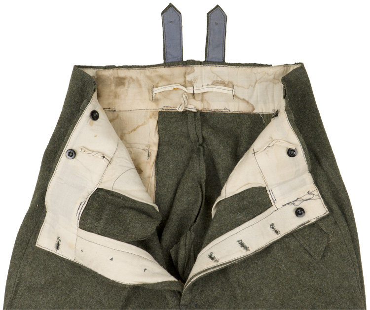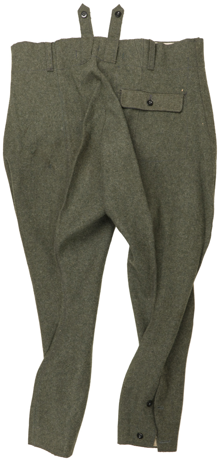 PHYSICAL DESCRIPTION: Issue style field-grey wool/rayon blend construction breeches. Buttons look to be original stitching. Roughly a 36 waist. Stain to the interior lining, but other wise very nice.