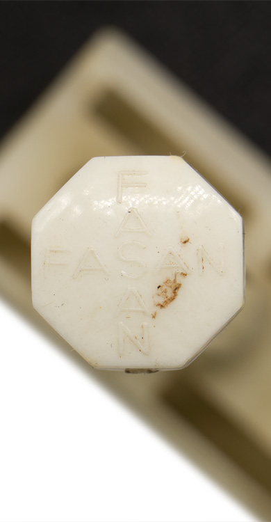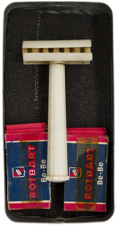 . (Rasiermesser mit Kasten)Metal tin with ventilation holes, DRGM marked. Fasan brand white Bakelite razor with two boxes of Rotbart blades. Shows the expected age and use, but overall nice condition.
