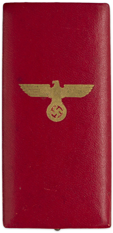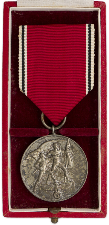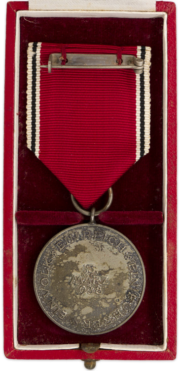 PHYSICAL DESCRIPTION: Silver washed, die struck alloy construction medal. The obverse of the medal features two embossed figures symbolically breaking the chains of bondage with an unfurled national flag in the background and a high relief national eagle to the bottom. The reverse features embossed Latin script to the center, "13th März 1938", encompassed by additional script, "Ein Volk, Ein Reich, Ein Führer". (One People, One State, One Leader). The ribbon suspension ring and medal loop are both intact and the award comes complete with its original ribbed rayon ribbon with an alloy pin back device, handstitched to the reverse top. Original case is included.