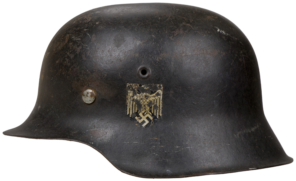 BACKGROUND: The first "modern" steel helmets were introduced by the French army in early 1915 and were shortly followed by the British army later that year. With plans on the drawing board, experimental helmets in the field, ("Gaede" helmet), and some captured French and British helmets the German army began tests for their own steel helmet at the Kummersdorf Proving Grounds in November, and in the field in December 1915. An acceptable pattern was developed and approved and production began at Eisen-und Hüttenwerke, AG Thale/Harz, in the spring of 1916. These first modern M16 helmets evolved into the M18 helmets by the end of WWI. The M16 and M18 helmets remained in usage through-out the Weimar Reichswehr era and on into the early years of the Third Reich until the development of the smaller, lighter M35 style helmet in June 1935. In an effort to reduced construction time and labor costs minor modifications were introduced in March 1940 resulting in the M40 helmet. Further construction modifications were undertaken in August 1942 resulting in the M42 helmet. Originally the Third Reich national tri-color helmet decal was introduced on March 14TH 1933 for wear on the left side of the helmet to replace the Reichswehr era state shield insignia. Regulations of February 17TH 1934 introduced the Wehrmacht eagle decal and the national tri-color decal was shifted to the right side of the helmet with the Wehrmacht eagle decal positioned on the left hand side. Regulations of March 21ST 1940 dictated that the national tri-color decal was to be removed from all helmets and further regulations of August 28TH 1943 abolished the Wehrmacht eagle decal and dictated that it was also to be removed from all helmets although the directives were not completely adhered to.